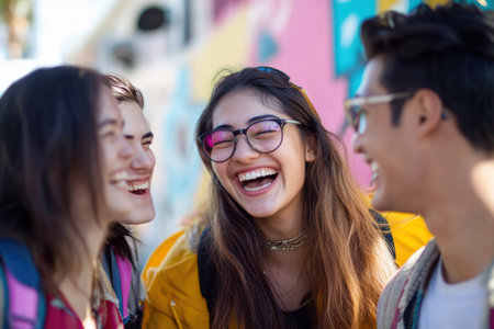 A group of friends enjoys a moment of laughter in a lively city environment, surrounded by bright colors and dynamic interactions. The joy is palpable.