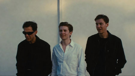 Three young adults stand against a minimalist white wall; a woman on the left looks at the man in the center, who looks at the woman on the right. The image captures casual fashion, social dynamics, and diverse relationships in a studio setting.