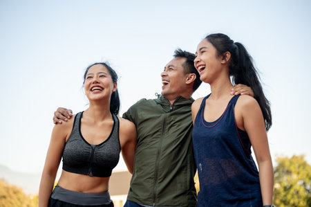 Portrait of a group of young, cheerful Asian athlete friends in sportswear walking together in the stadium after running. friendship, people, sport
