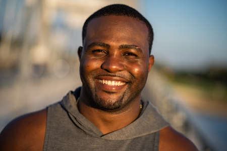 Portrait of young cheerful african-american man in sports clothing who is looking at camera and smiling.