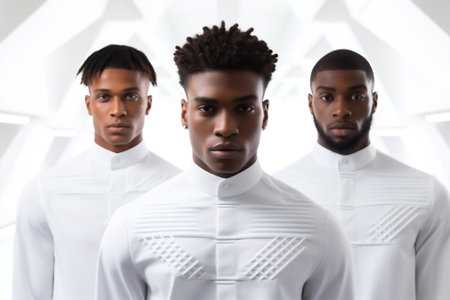 Three individuals in striking white garments, each with unique styling and expressions, create a captivating visual narrative against a dark backdrop highlighting their fashion choices, AI generated