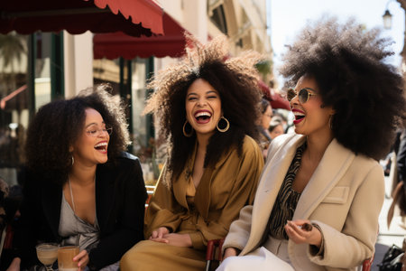 Three women are captured in a candid moment, laughing while sitting outdoors. The composition features soft lighting and a shallow depth of field, highlighting the subjects. The setting appears to be an urban environment, possibly a shopping district. This image could be used for various commercial and editorial purposes.