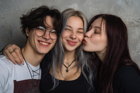 Three individuals share a captivating moment under soft lighting, showing a blend of natural beauty and elegance with an intense gaze. Perfect for creative projects. Generated A.I.