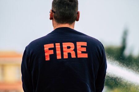 Paphos Cyprus March 04, 2020 View of a Cypriot firefighter putting out a brush fire near Paphos