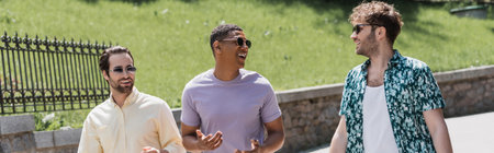 Carefree multiethnic friends in sunglasses talking while spending time in park at daytime, banner