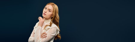 A confident young woman poses elegantly, her long hair flowing in a chic outfit.