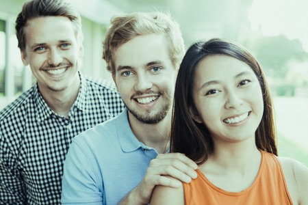 Carefree young friends looking at camera and standing in row. Happy students enjoying their life. They supporting each other and having good relationship. Friendship concept