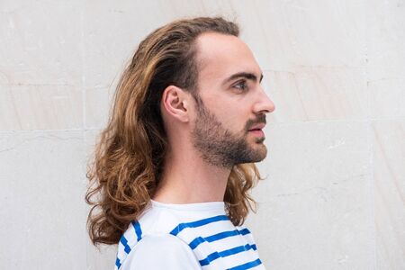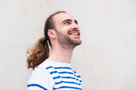side portrait of young man with long hair in ponytail smiling and looking up by white background