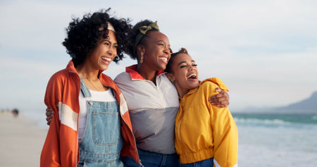 Friends, hug and outdoor laugh on sand, beach freedom and weekend trip to ocean waves. Women, people and travel to sea with energy for funny conversation, embrace and holiday for humor in Mauritius