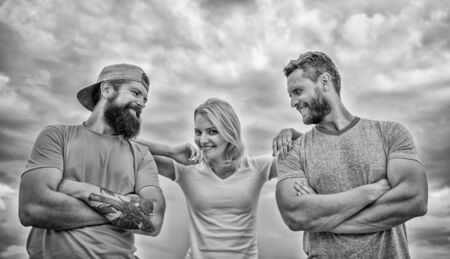 Trust and support attributes of true team. United by idea. Woman and men look confident while stay close each other like team. Shoulder on which you can rely. Feel comfortable with friends teammates