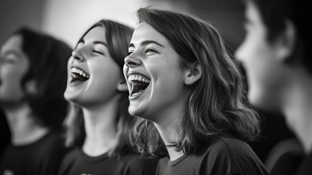 Young individuals sharing joyful laughter, captured in a black and white portrait. The moment reflects happiness and togetherness during a lively performance.