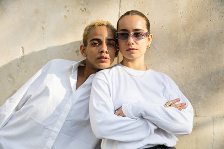 A young woman and man in crisp white attire share a close moment, reflecting a bond of friendship or kinship, highlighted by a warm, textured urban wall.