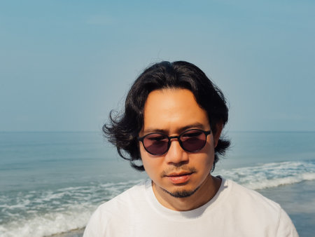 Asian man wears white t-shirt and sunglasses enjoy walking on the beach in Thailand.