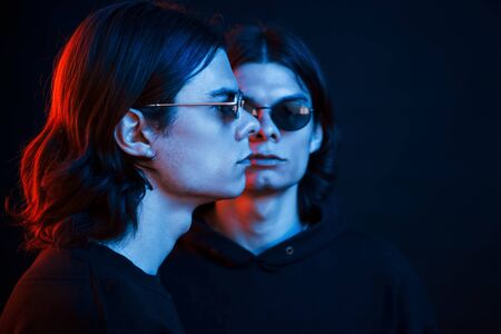 Looking in front and to the side. Portrait of twin brothers. Studio shot in dark studio with neon light.