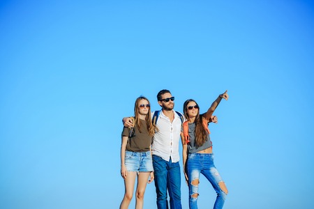 Bearded handsome man and two pretty sexy cute girls or women in jeans and shorts with backpacks outdoor on sunny day with raised hands on blue sky background