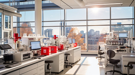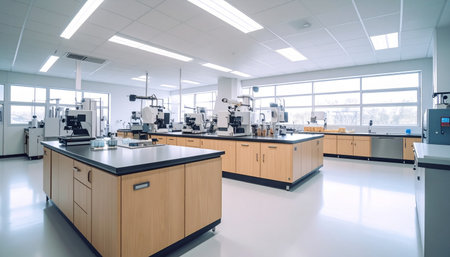 Interior of a modern scientific laboratory with equipment and science experiments.