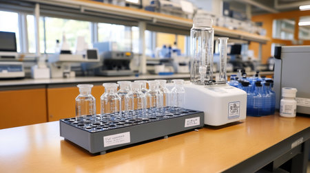 Empty science laboratory test tubes on a sterile bench, surrounded by chemical equipment. Ideal for research purposes.