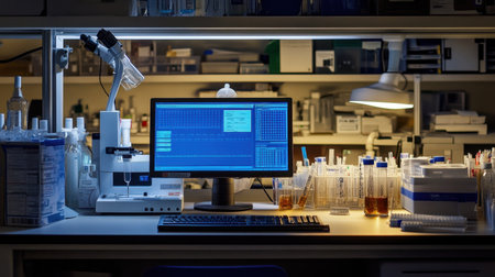 A focused shot of pipettes and beakers on a cluttered table with a highresolution computer screen showing detailed cellular structures and analysis software running..