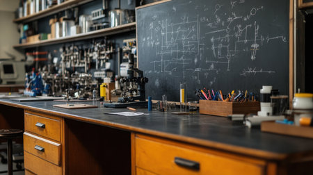 A well-organized laboratory workspace showcases various scientific instruments and colorful writing tools against a detailed chalkboard filled with notes, perfect for research and learning.