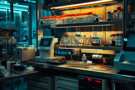 A well-equipped laboratory displays numerous glass containers filled with liquids on shelves, alongside advanced scientific instruments, all illuminated in ambient lighting.