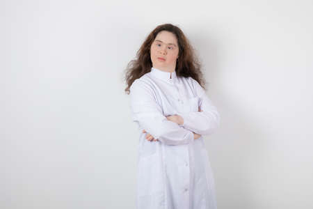 Portrait of a young girl with down syndrome standing with crossed arms