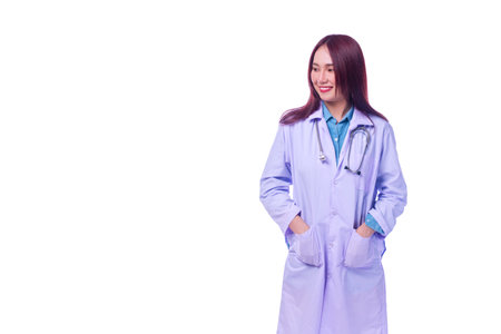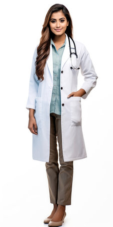 Portrait of confident female doctor standing with hands in pockets on white background