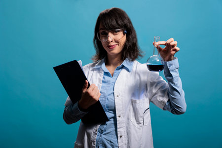 Female assistant scientist in white coat and plastic protective glasses over white isolated background inspecting flask filled with substance, healthcare, profession, science and concept
