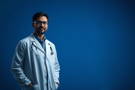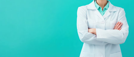 A medical professional stands confidently with arms crossed in a lab coat showcasing professionalism against a bright turquoise background.