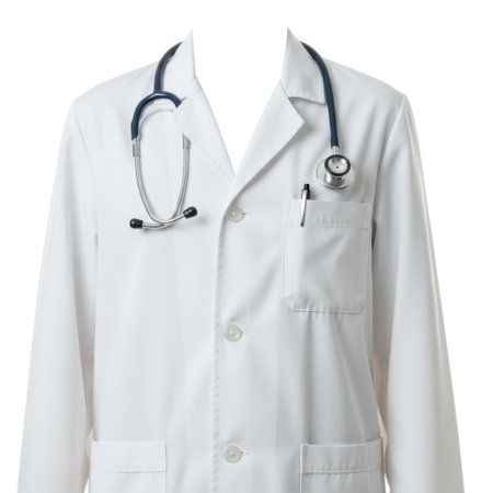 A crisp white doctor's coat with a stethoscope resting on the collar, presented cleanly on a white background.