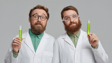 Two male scientists wearing white lab coats and glasses hold test tubes filled with vibrant green liquid, showcasing excitement and curiosity in their research lab setting.