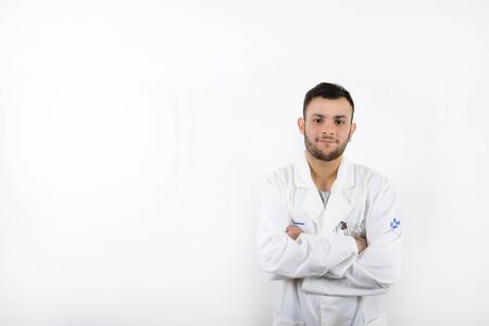 Smiling and willing Young male doctor with beard with arms folded isolated on white background