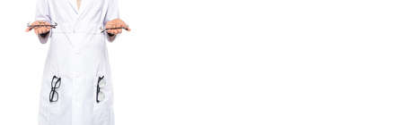 Cropped view of african american ophthalmologist holding optical eyeglasses isolated on white, banner