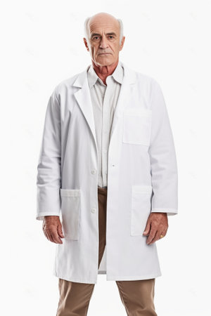 Confident senior doctor Senior grey hair doctor in uniform looking at camera and holding hands in pockets while standing isolated on white : Generative AI
