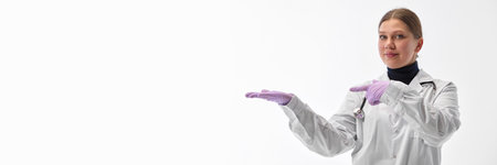 Banner. Charming young woman posing as she demonstrate something against white studio background with negative space to insert your text. Concept of medicine, health care, work. Ad