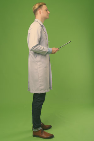 Young handsome man doctor with blond hair against green background