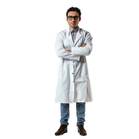 Professional young man in lab coat over transparent background looking assured