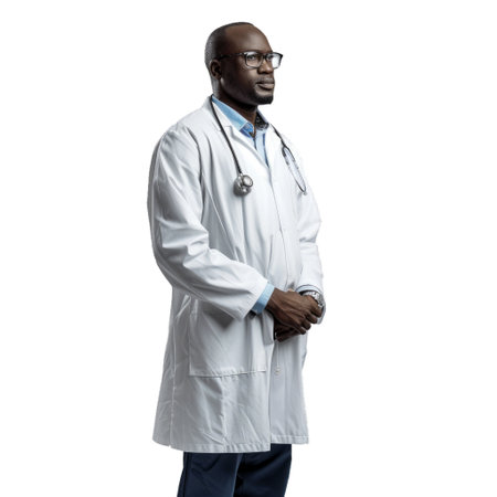 Professional african male doctor in white coat posing with a stethoscope on a transparent checkered pattern