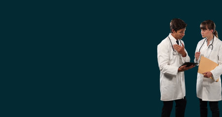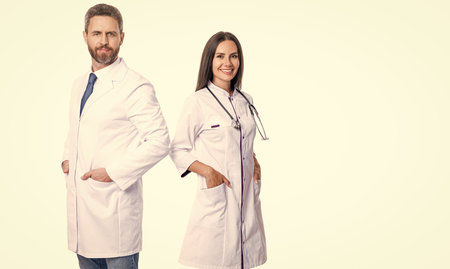 doctor at hospital. two doctor in medical practice. doctor with stethoscope isolated on white. professional physician in white coat with medical woman. medicine and healthcare. advertisement