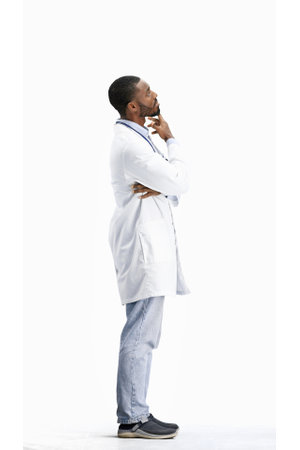 The doctor, in full height, on a white background, thinks