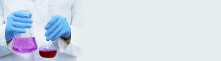 Banner with chemist holding an Erlenmeyer or conical glass flask for titration with bright liquids with copy space. Modern analytical chemistry laboratory