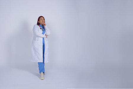 Young Colombian female doctor, in a white coat and uniform, is standing with her hand on her chin and looking up, thinking about treatment for a diagnosis, copy space, white background, studio shot.