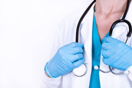 Doctor with a stethoscope in his hands in a white coat and gloves