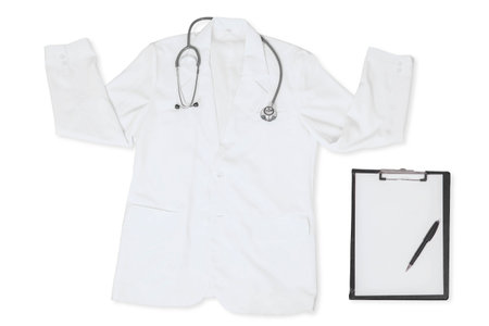 Doctor coat with a stethoscope and empty clipboard, isolated on white background