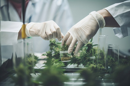cannabis research, medical scientists are studying hemp and cannabis leaves in a green laboratory for potential medicinal benefits