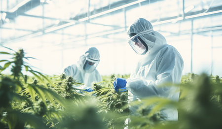 Scientists in protective gear meticulously examining cannabis plants in a state-of-the-art indoor growing facility.