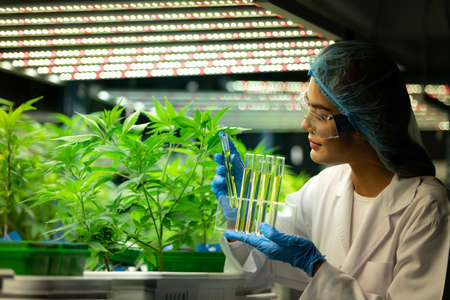 Scientist test cannabis product in curative indoor cannabis farm with scientific equipment before harvesting to produce cannabis products