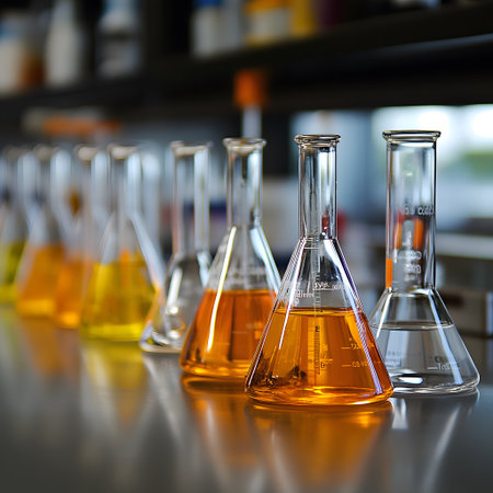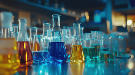 A vibrant laboratory scene featuring glass flasks with colorful liquids, highlighting scientific experimentation and research in a modern environment.