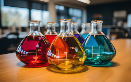 Close-up of laboratory glassware including test tubes and beakers filled with colorful liquids, in a vibrant, modern science laboratory setting.