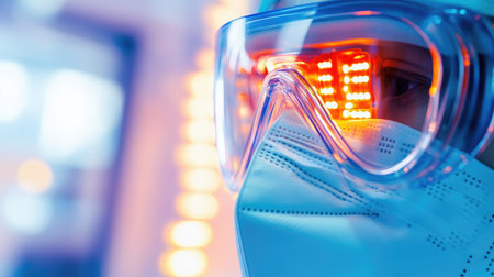 This close-up captures an individual wearing protective gear, showcasing safety goggles and a medical mask against a backdrop of colorful lights. Perfect for health and safety themes.