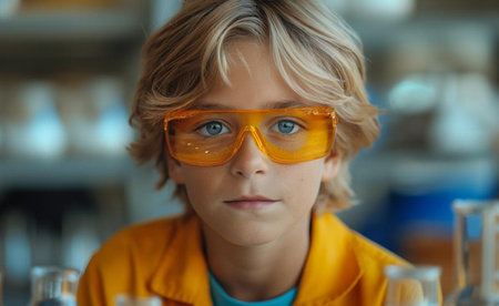A boy in protective glasses in a laboratory with test tubes, created with Generative AI technology.